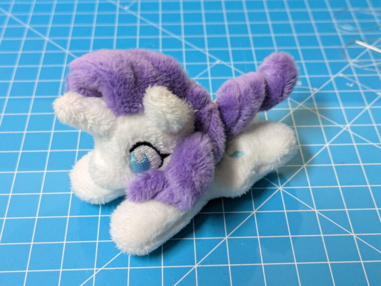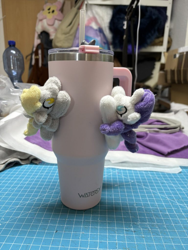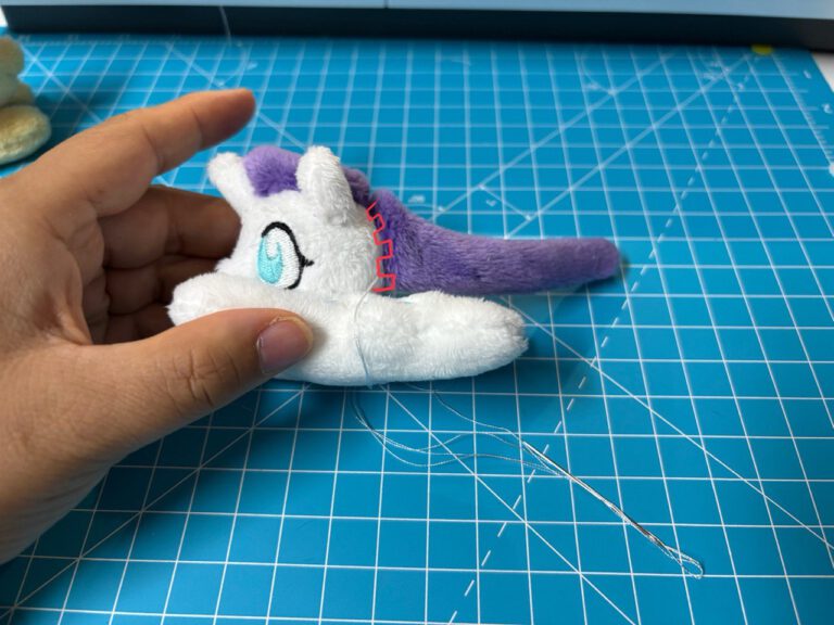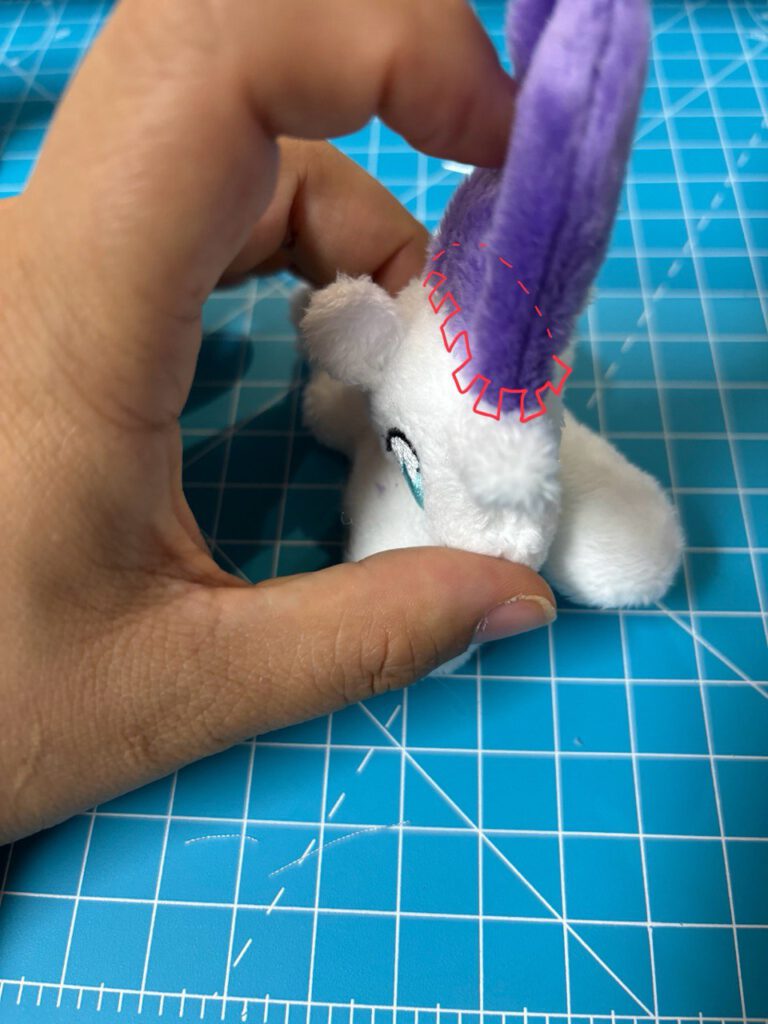 Last but not least do the same as before (taped pipecleaner to the hole) and attach it with a ladderstitch in the space between her cutiemarks. After this is done you can play a litttle: Hairstyler! Bend her mane pieces around the chopsticks and give her some beautiful curls.