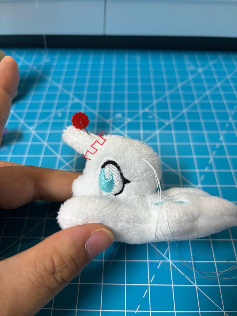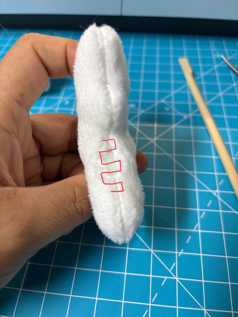 Take your ears and pinch them together. Feed the needle through both outer corners to make this cute little fold.